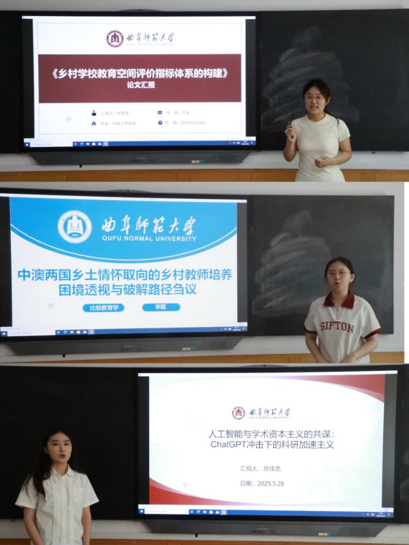 活动中,汇报人就ChatGPT、乡村教育等学科热点从研究背景、研究目的、研究方法、研究结果等方面进行了系统阐述,汇报结束后,三位研究生就汇报内容与评委老师展开深入讨论,并分享了各自的研究心得和体会。评委们针对每篇论文在文献引用、数据分析等方面存在的问题,提出了具体且富有建设性的修改建议。
