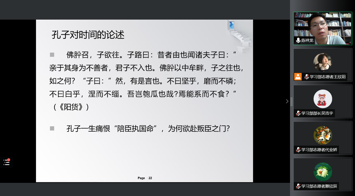 报告会上,陈祥龙老师以《论语》首章为例,谈论对经典阅读的感受,与大家分享了经典阅读中“博”与“约”、“逆流而上”与“顺流而下”、“问题导向”与“学科立场”三个问题,并对《论语》中的学文与学道、时时与适时做了区分。最后,陈祥龙博士强调,教育是缓解焦虑最好的手段,有对学习的志向就会克制外界的吸引,保持问题意识是做学术研究的最基本要求。