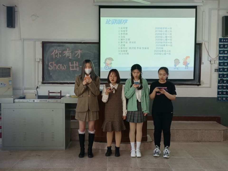 活动起始,主持人上台主持开场,宣布比赛开始。参赛选手以舞蹈和歌唱为主要表演形式,舞蹈表演展现了选手优秀的舞台表现力,歌曲演唱表达了选手丰富细腻的情感。最后评委根据表演情况进行现场打分,比赛在活跃的气氛中落下帷幕。本次比赛迟橙获得一等奖;张晓萱,安芮萱获得二等奖;冀叶文锡,李雨珊,惠子淑队,秦乐妍队,获得三等奖。