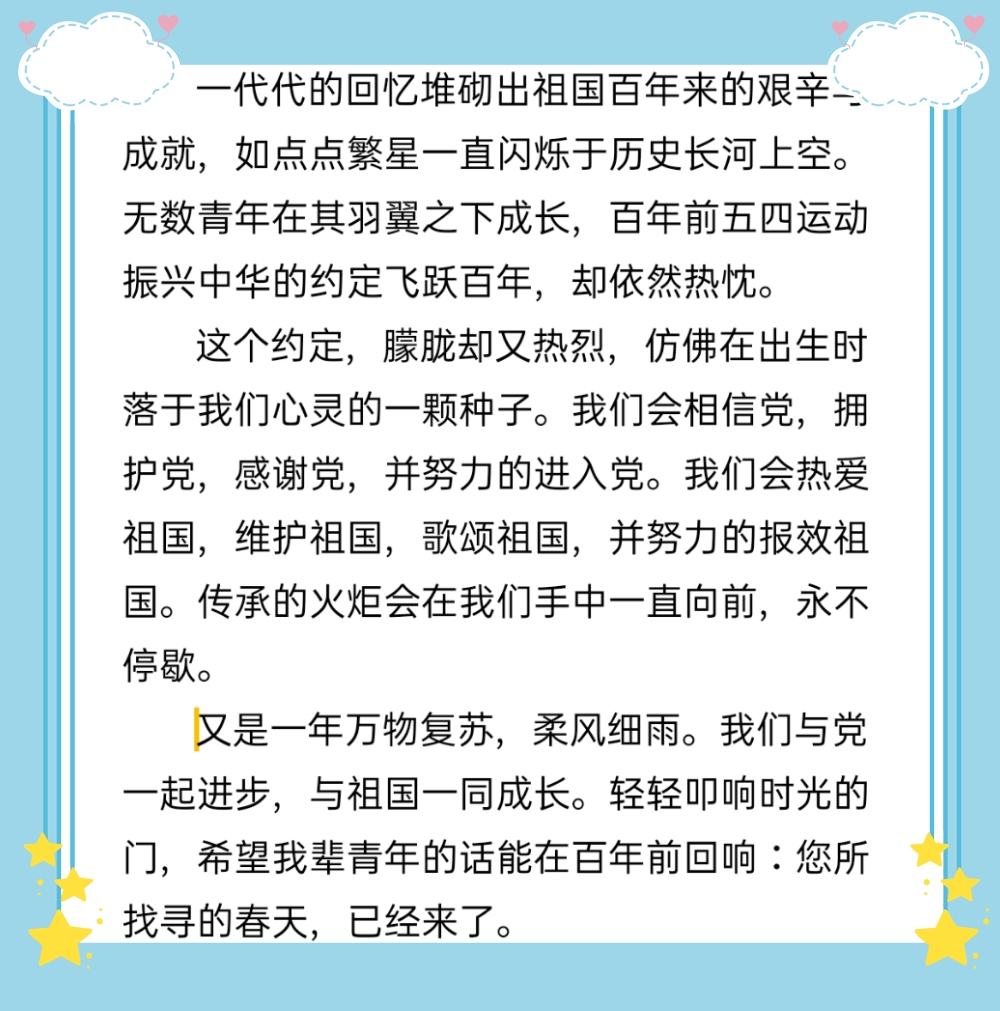 征文要求以五四青年节为背景,以歌颂党的丰功伟绩,以爱党、爱国、敬业、乐业为主要内容,主题鲜明,立意新颖,内容积极向上,思想性教育性强,能够充分展现当代大学生的良好精神风貌。征文比赛中同学们积极参与,踊跃来稿,用自己的笔记录了对祖国的热爱。经过评选,在本次征文比赛中,于小迪荣获一等奖,张凤娟、孙秀芝、杨寒超荣获二等奖,范志星、刘华倩、刘怡菲、王春婷、周四琳荣获三等奖。