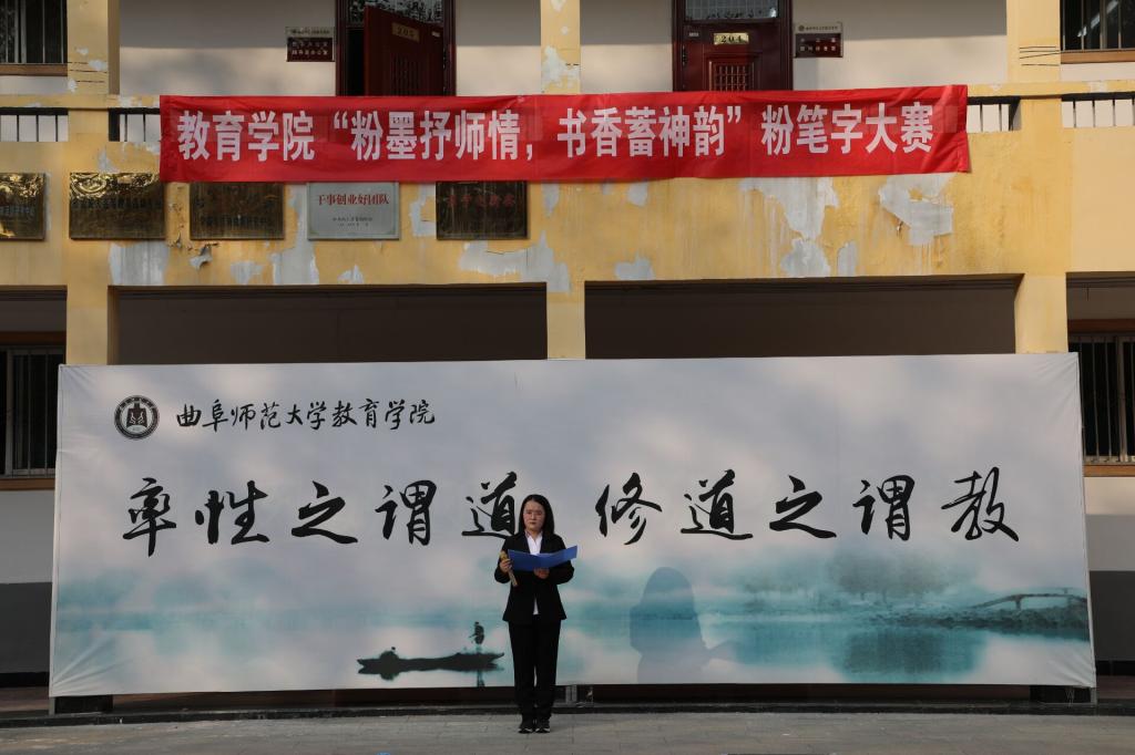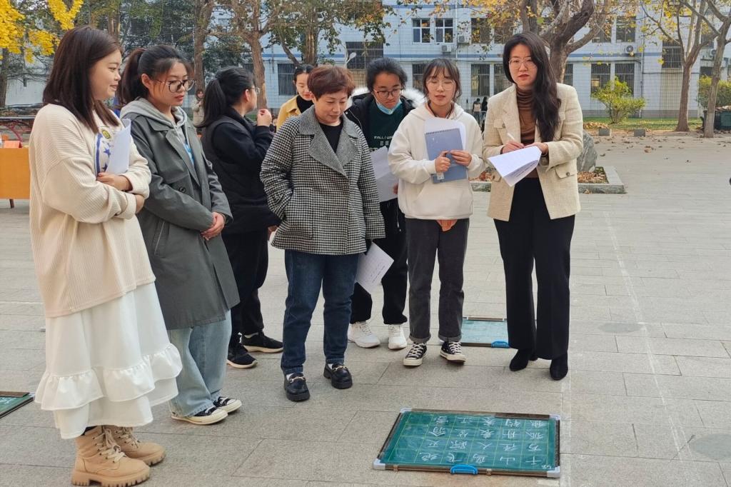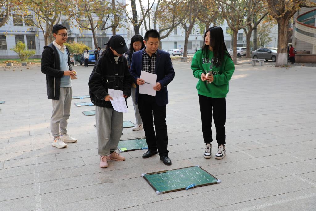 为强化师范生教学技能,提高师范生培养质量,展现师范生良好的专业素养,11月17日,黄色漫画 学生会学习部、宿管部在黄色漫画 楼前举办“粉墨抒师情,书香蓄神韵”粉笔字大赛。学院党委副书记孙超出席活动,团委书记周长缨,辅导员王保英、张东霞、商雪敏参加活动。本次比赛特邀书法学院徐可然老师,兰亭书社社长李思娜和部分社员担任评委。
