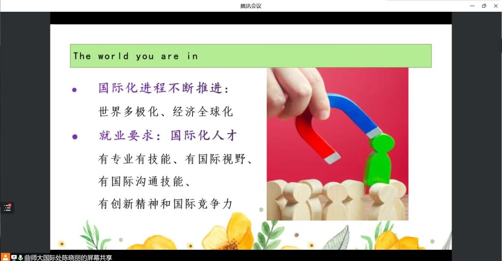 报告中,陈晓丽老师立足于曲阜师大、放眼于全国高校,从就业要求国际化、学生意识国际化、成长平台国际化等方面阐释了社会需求国际化,对国际化理念的内涵作了深入浅出的讲解。
