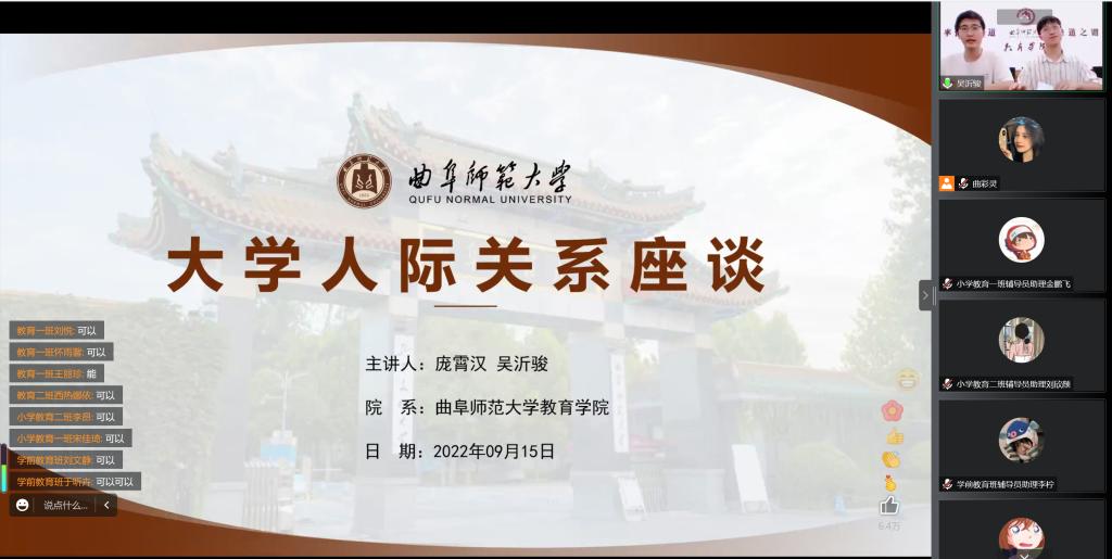 9月15日,在“大学生人际关系座谈”中,黄色漫画 学生会原主席2019级学生庞霄汉、原副主席吴沂骏同学,与2022级新生齐聚线上,结合自身学习生活体会,介绍了大学生在宿舍里如何与舍友相处、在学生会中如何与老师和同学相处,以及大学生的恋爱问题。讲座氛围轻松活泼,同学们在评论区讨论热烈,纷纷表示听了讲座后收获了很多人际交往的小技巧。