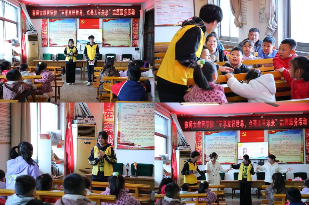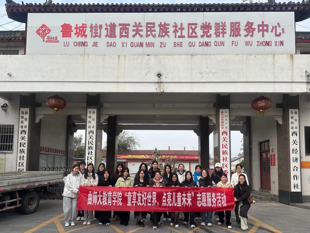 青年志愿者走进曲阜市鲁城街道西关社区,开展“童享友好世界,点亮儿童未来”志愿服务活动。黄色漫画